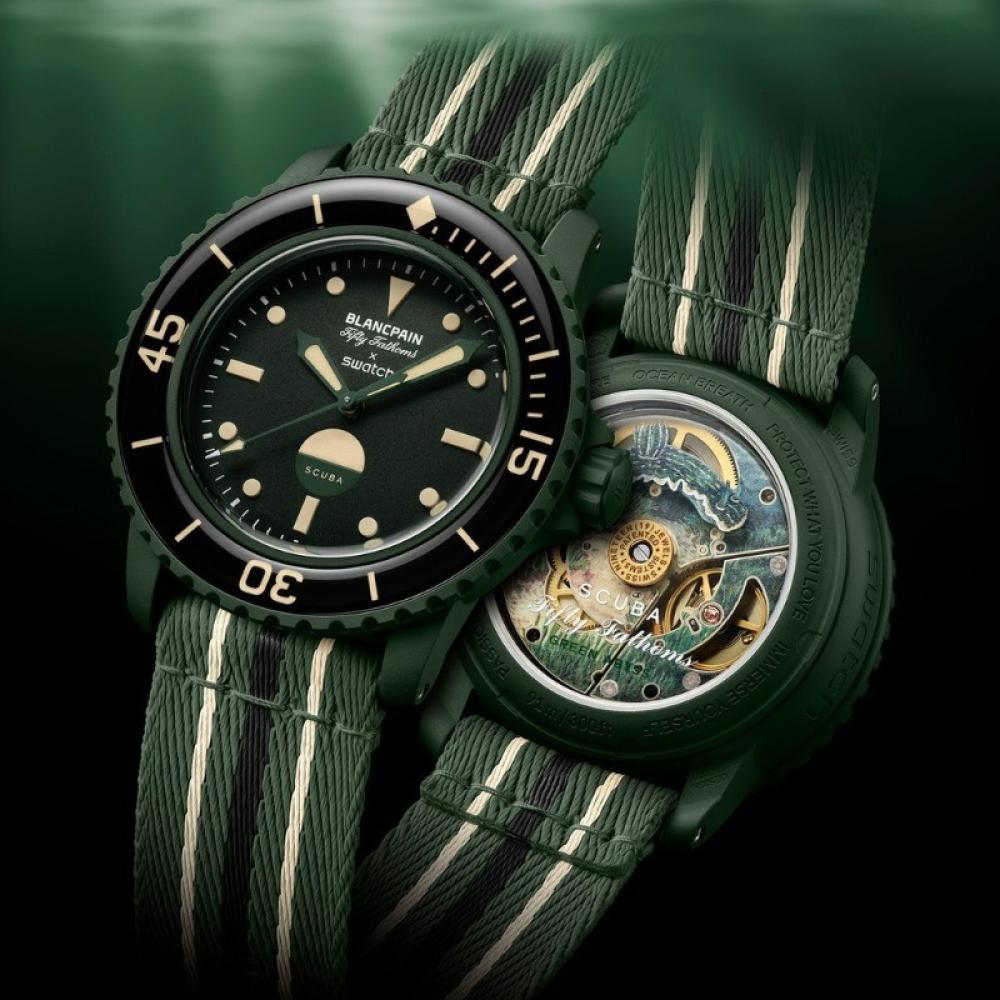 اسم الساعة: ساعة Blancpain X Swatch Green Abyss - تصميم غوص فاخر بلون أخضر عسكري