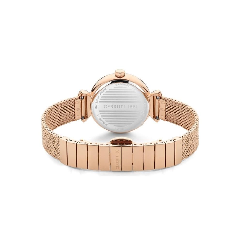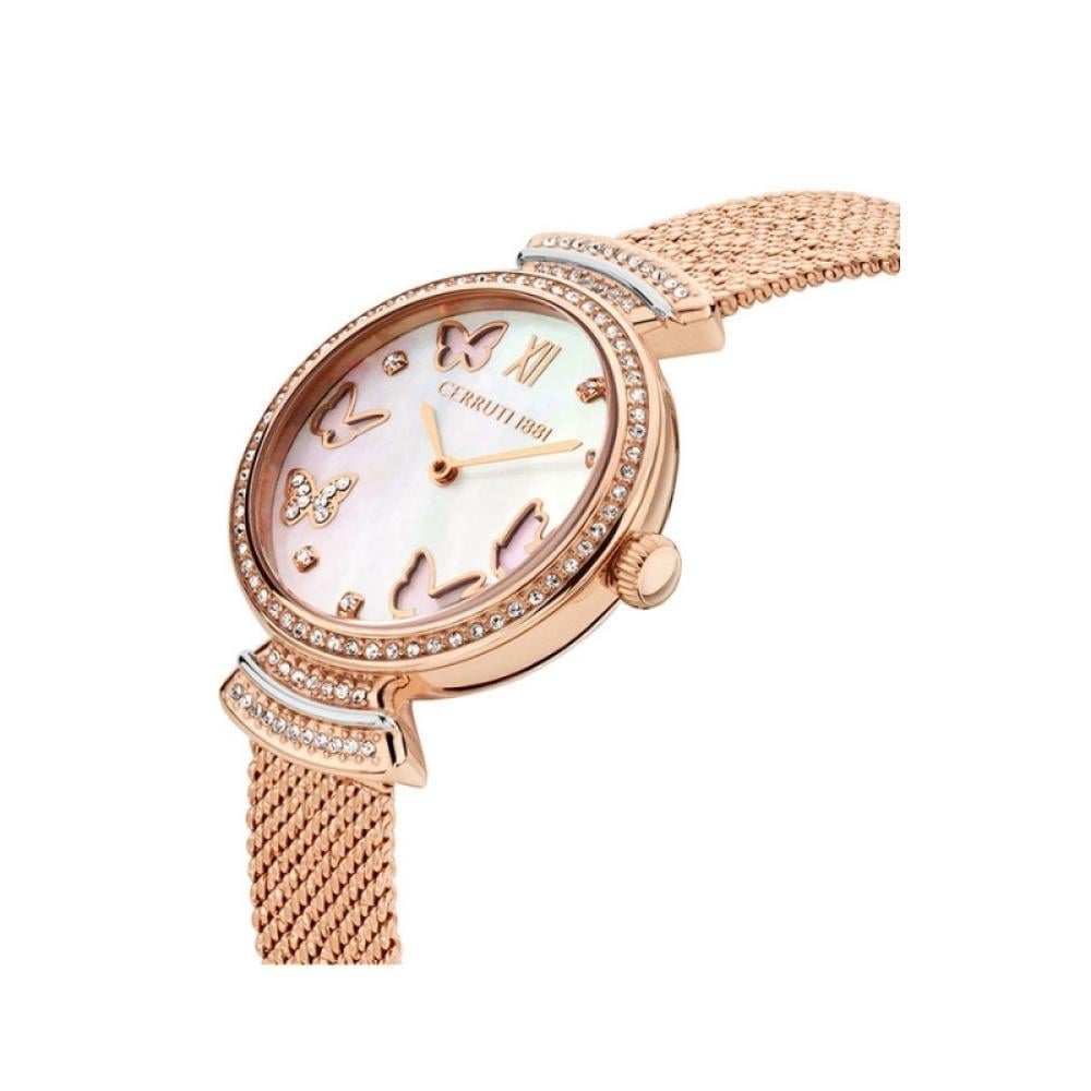 استمتعي بأناقة أنثوية ساحرة مع ساعة تشيروتي النسائية الفاخرة. تتميز بميناء لؤلؤي مزخرف بفراشات وردية تمنحها لمسة ناعمة وفاخرة، مع علامات مرصعة بالكريستال البراق لإضفاء مزيد من الأناقة. الإطار مرصع بكريستالات متألقة تزيد من جمال التصميم، ويكتمل بسوار شبكي أنيق بلون ذهبي وردي يمنحك إطلالة راقية تناسب مختلف المناسبات.