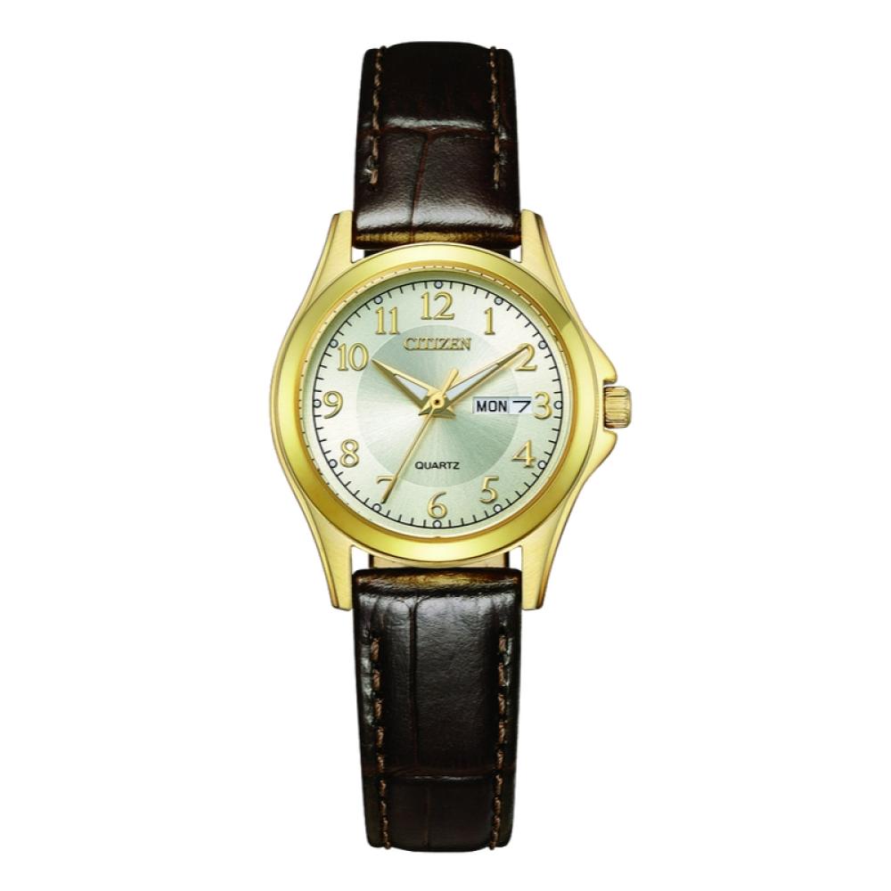 ساعة سيتيزن كوارتز نسائية بمينا شامبانيا وهيكل ذهبي وسوار جلد بني - 27 مم