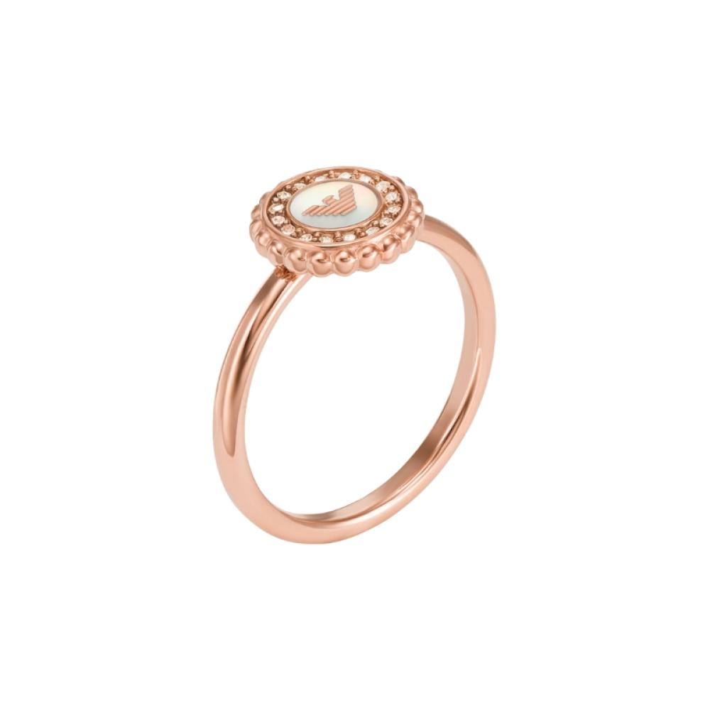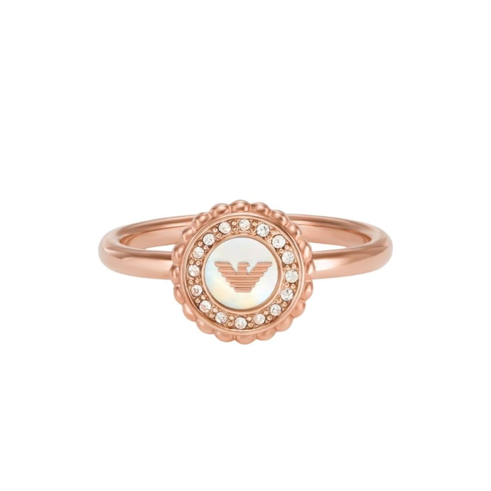خاتم فاخر بتصميم جذاب من إمبوريو أرماني، مصنوع بلون ذهبي وردي ساحر ومرصع بحبات كريستال براقة تحيط بشعار إمبوريو أرماني الأنيق في المنتصف. يعتبر هذا الخاتم إضافة رائعة لإطلالتك، سواء في المناسبات الخاصة أو الإطلالات اليومية.