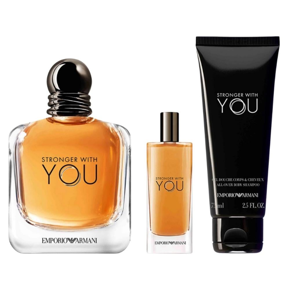 اسم العطر: طقم إمبوريو أرماني سترونغر ويذ يو أو دو تواليت للرجال مع جل استحمام وبخاخ سفر – Emporio Armani Stronger With You Eau de Toilette Gift Set