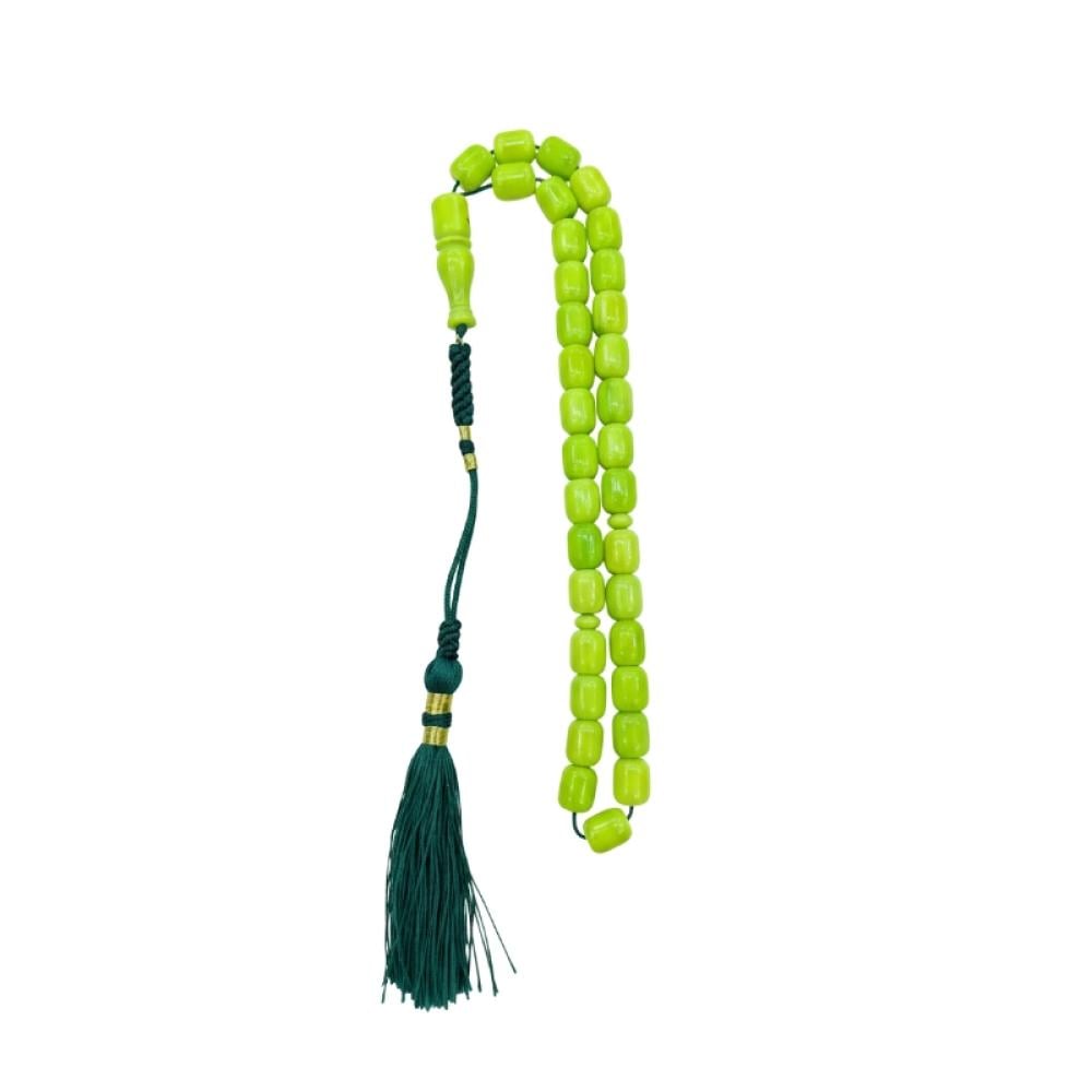 سبحة فاتوران تركي بلون أخضر ليموني – 33 خرزة بيضاوية مع كركوشة خضراء منسوجة