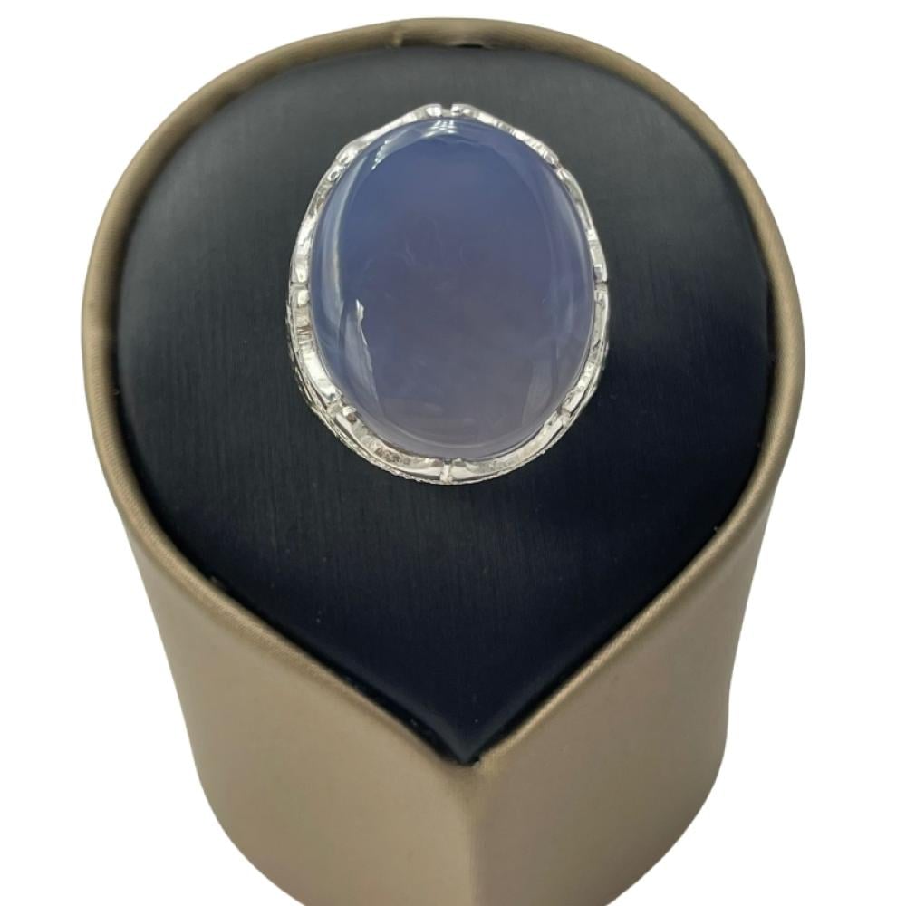 - الحجر: عقيق يماني طبيعي بلون سماوي ناعم، يرمز إلى الصفاء والسكينة، يتميز بسطح أملس ولمعان رقيق يضفي لمسة من الهدوء والأناقة.