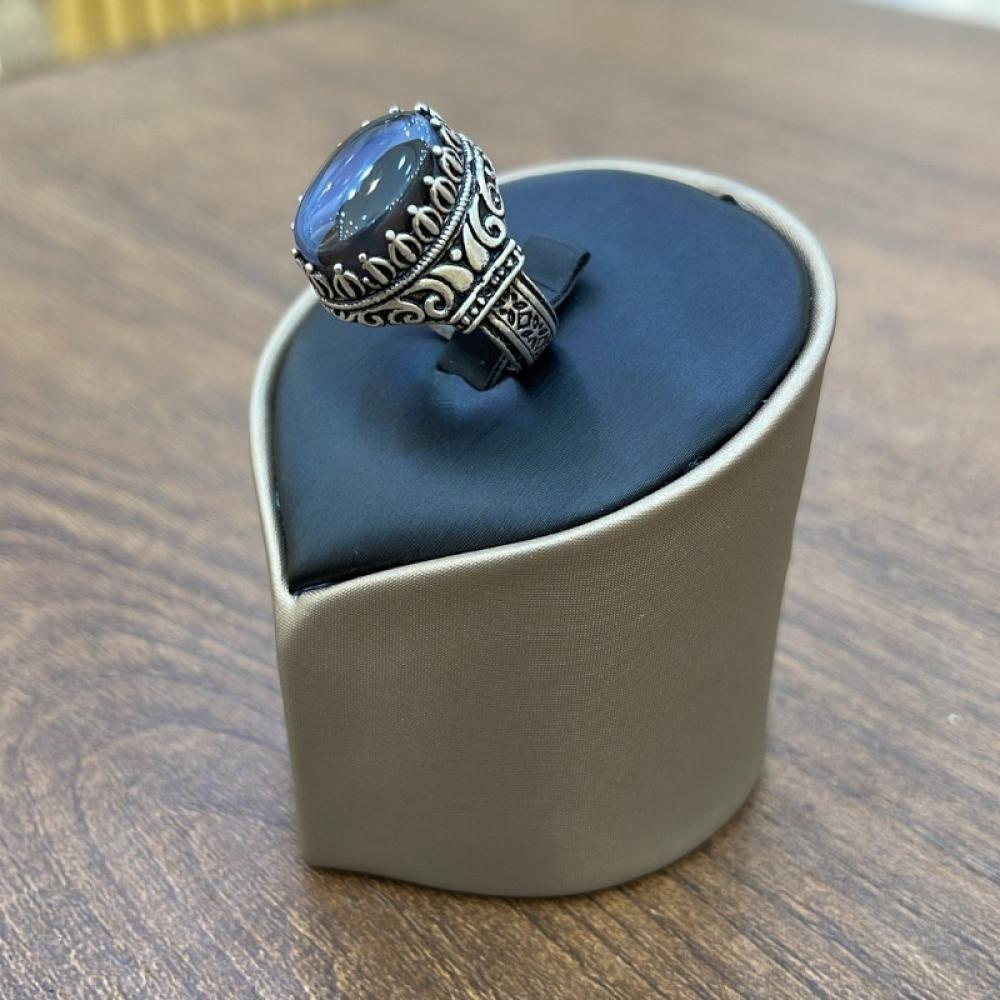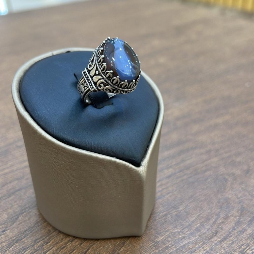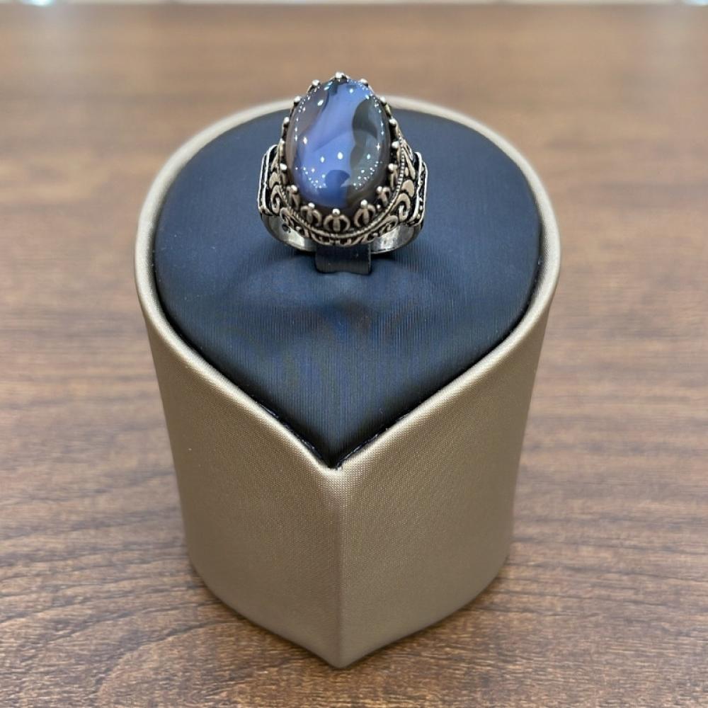 • الحجر الكريم: عقيق يماني طبيعي بلون أزرق غامق يتغير تدرجه بين الأزرق الداكن والرمادي الباهت، ما يضفي لمسة من الغموض والسحر على التصميم.