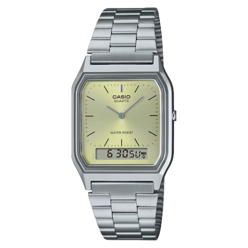 ساعة كاسيو كلاسيكية تناظرية رقمية للرجال – مينا ذهبي فاتح – سوار ستانلس ستيل فضي – موديل AQ-230GA-9DMQ