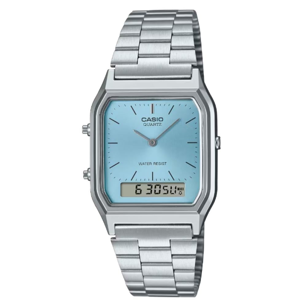 ساعة كاسيو كلاسيكية تناظرية رقمية للجنسين – مينا أزرق ثلجي – سوار ستانلس ستيل فضي – موديل AQ-230A-2A1MQY
