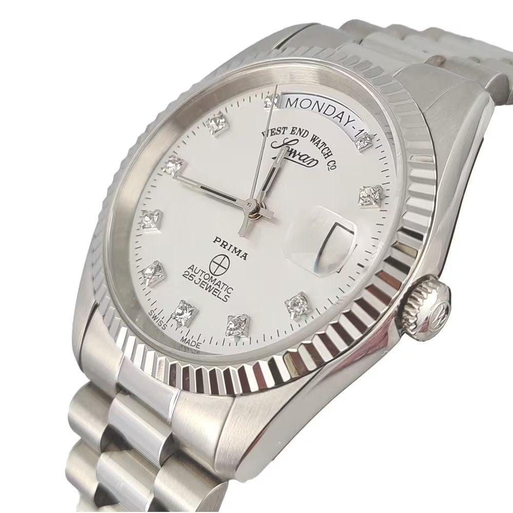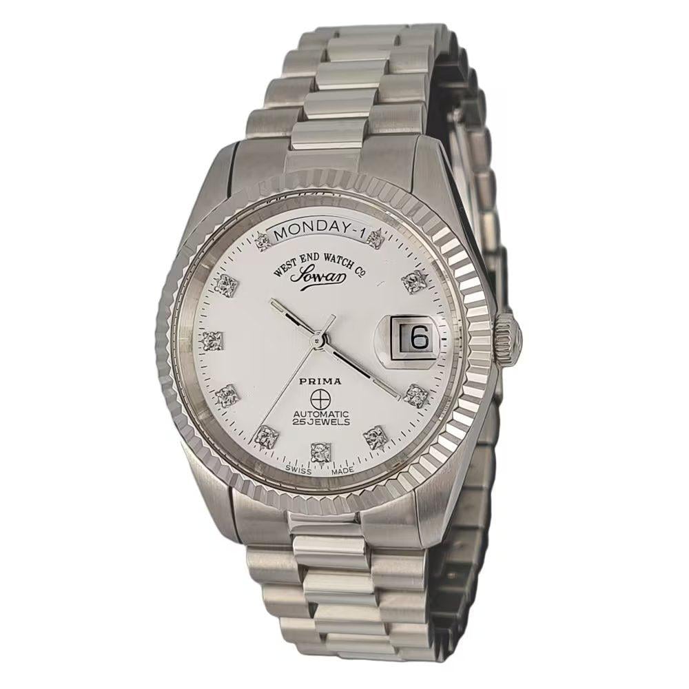 تتميز ساعة ويست إند سووار بريما الرجالية بمزيج فاخر يجمع بين الأصالة الكلاسيكية واللمسة العصرية. تأتي بميناء فضي لامع يزدان بمؤشرات مرصعة بأحجار ألماس صناعي تضفي حضوراً راقياً على التصميم. يظهر عرض اليوم أعلى الميناء بشكل واضح، فيما يبرز التاريخ عند موضع الساعة الثالثة بعدسة مكبرة تسهّل القراءة اليومية. يحيط بالميناء إطار مسنن كلاسيكي يعزز الفخامة، ويمنح السوار المعدني الثلاثي الروابط الراحة والمتانة على المعصم.