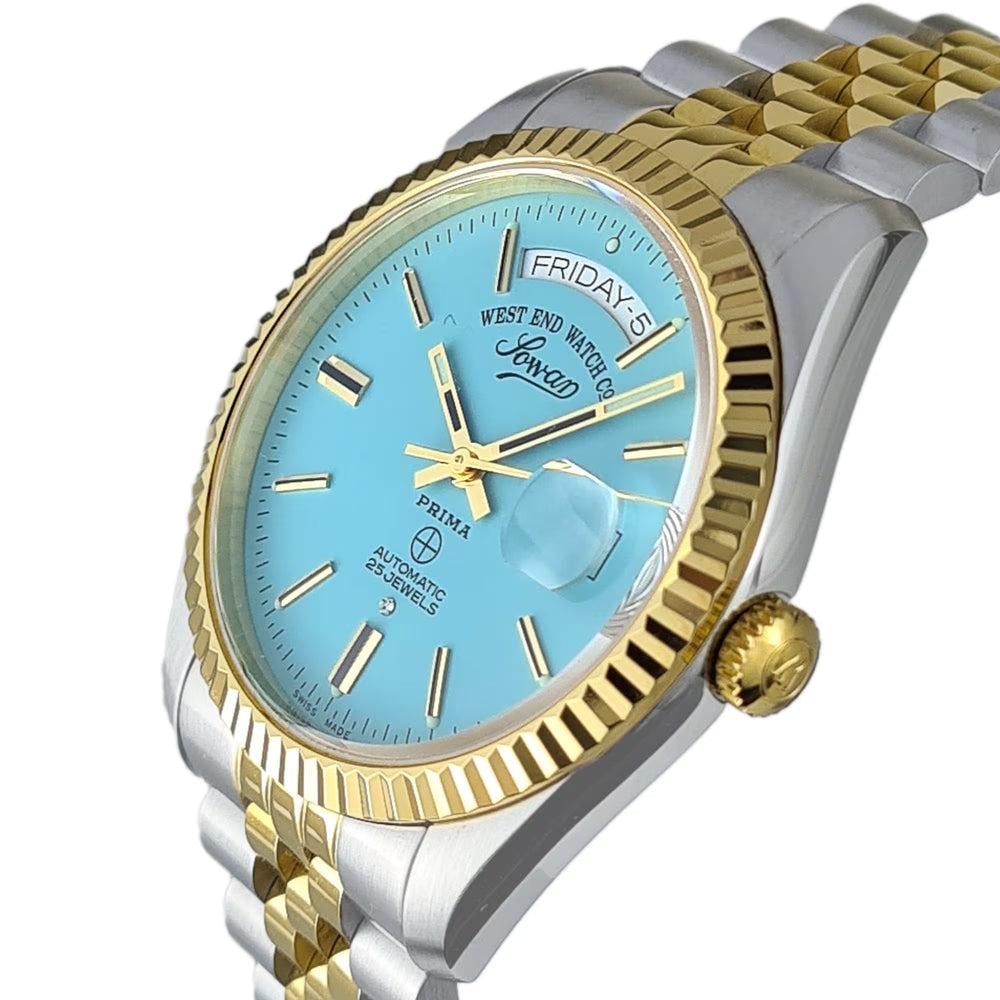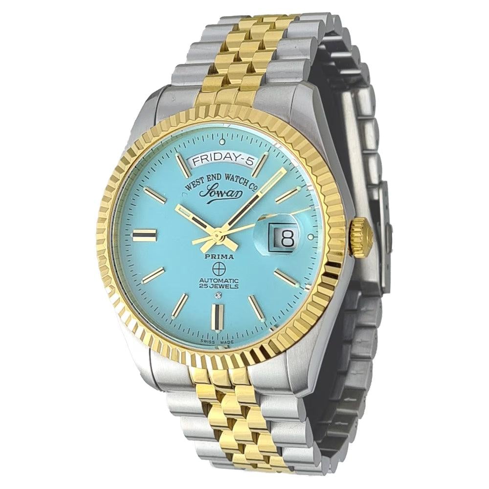 ساعة West End Sowar Prima بميناء أزرق تيفاني نابض بالحياة تمنح حضوراً فريداً وأسلوباً عصرياً يجمع بين الأناقة الكلاسيكية والفخامة الحديثة. الإطار الذهبي المسنن يضيف لمسة راقية، بينما يجعل السوار الجوبيلي ثنائي اللون الساعة أكثر تميزاً وفخامة.