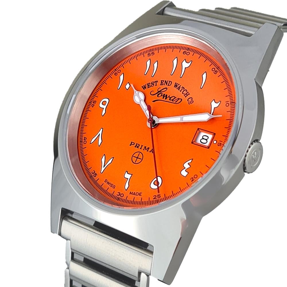ساعة West End Watch Co. Prima Arabic Dial 6841_10_3374R هي ساعة مميزة ذات تصميم ملفت يجمع بين العصرية والطابع الكلاسيكي الأنيق. يزين المينا البرتقالي المشرق أرقام عربية مضيئة تمنحها شخصية قوية ولمسة تراثية فريدة مع وضوح ممتاز للقراءة.